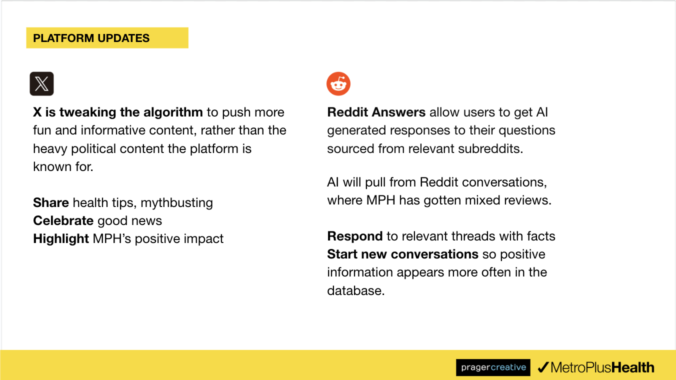 I compiled monthly trend reports for MetroPlusHealth, including platform updates, and their implications for our content, as well as social media and industry trends. These helped us to keep our clients up-to-date, and continually refresh our content and tactics.
