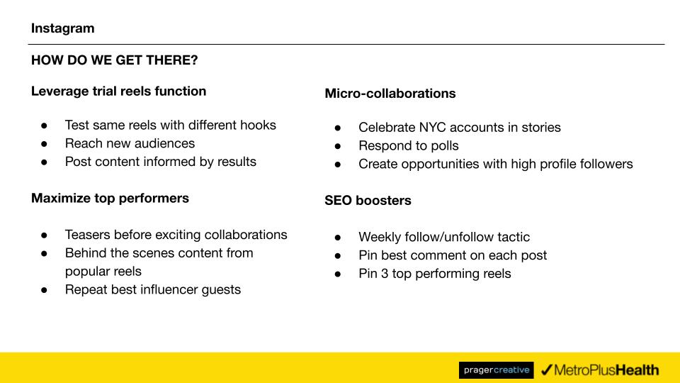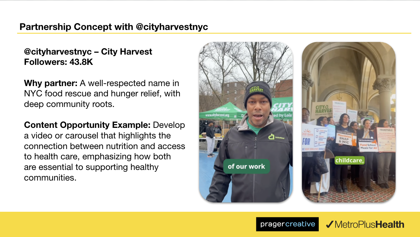 I generated ideas for new content and campaigns for MetroPlusHealth. My best ideas for this brand came from finding interesting content creators and organizations for the brand to partner with, as well as ideas for what collaborative content could consist of. Chronically online, and in-tune with NYC community content creators, I was able to make recommendations to bolster our existing content.